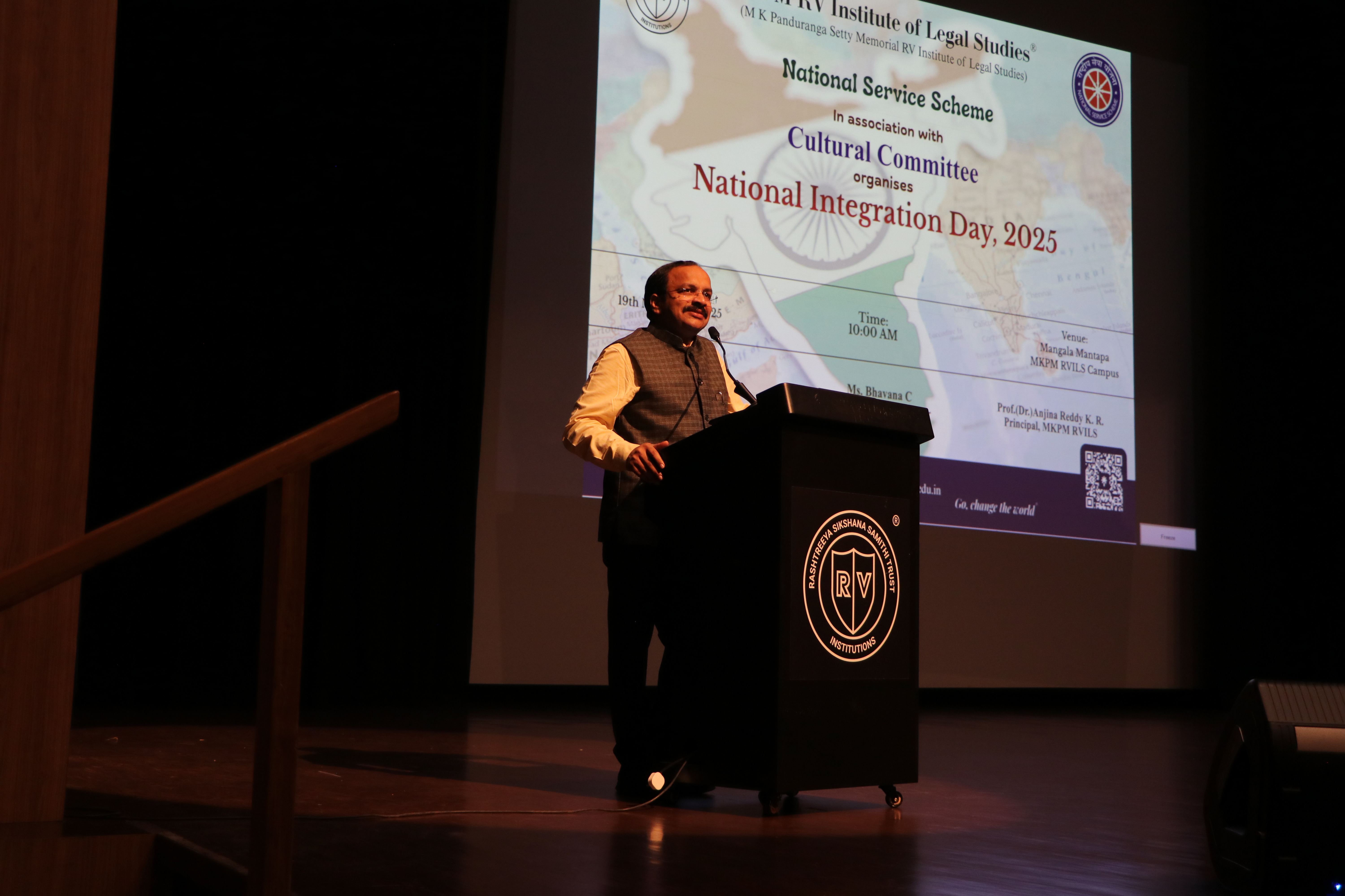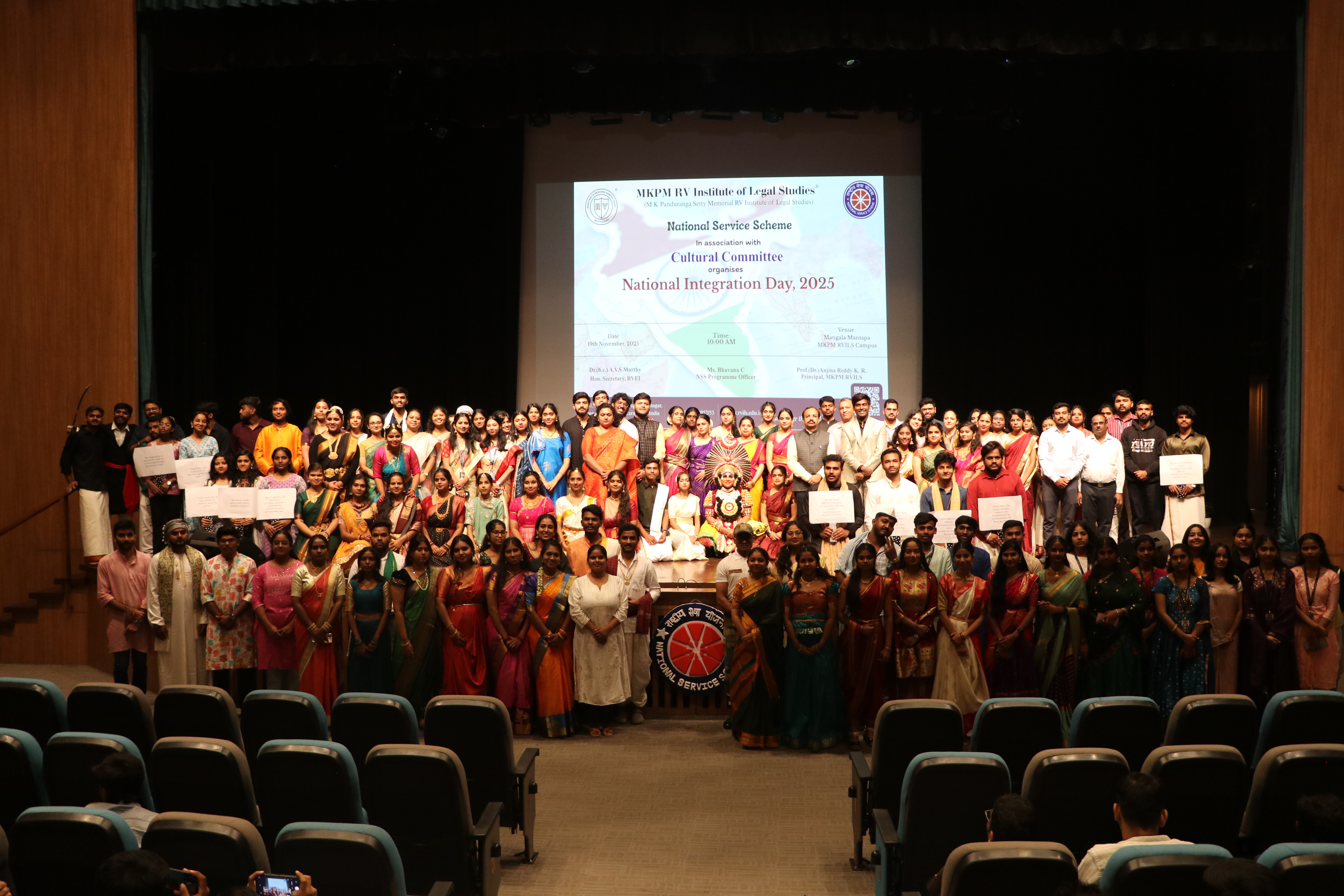 The M.K. Panduranga Setty Memorial RV Institute of Legal Studies (MKPM RVILS), through its National Service Scheme (NSS) Unit in association with the Cultural Committee, organised National Integration Day 2025 on 19th November 2025 at 10:00 am, Mangala Mantapa, MKPM RVILS Campus. The programme aimed to promote unity, cultural harmony, and a sense of shared national identity among students. The event highlighted the importance of integration as a foundational strength of India’s democratic fabric, encouraging students to uphold constitutional values and foster inclusivity. The event was graced by Prof. (Dr.) Anjina Reddy K. R., Principal, MKPM RVILS, coordinated by Ms Bhavana C, NSS Programme Officer. The celebration brought together students and faculty in a collective reflection on the significance of national unity and responsible citizenship. The programme featured activities that reinforced the spirit of togetherness and communal harmony, marking the occasion with enthusiasm and active student participation.