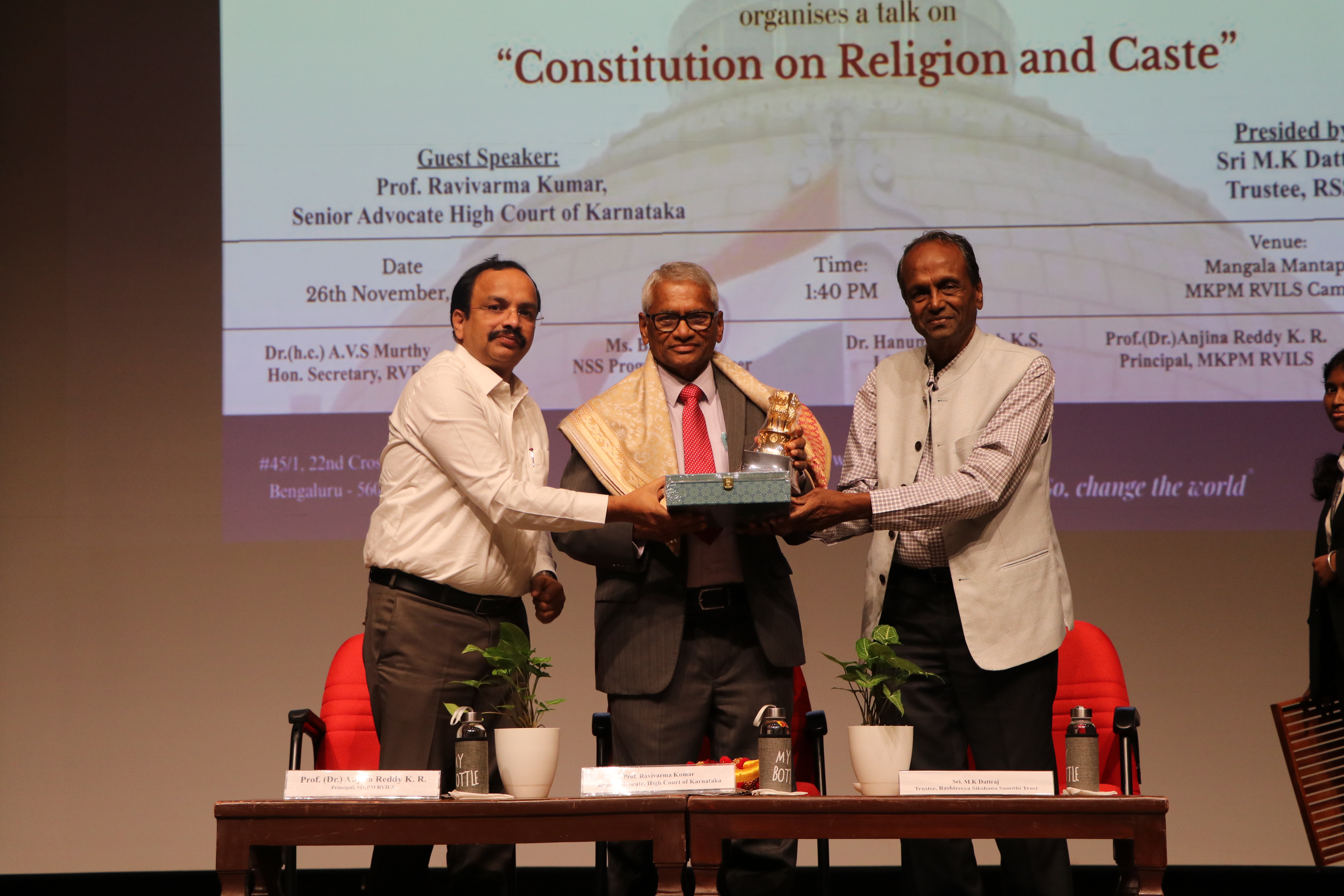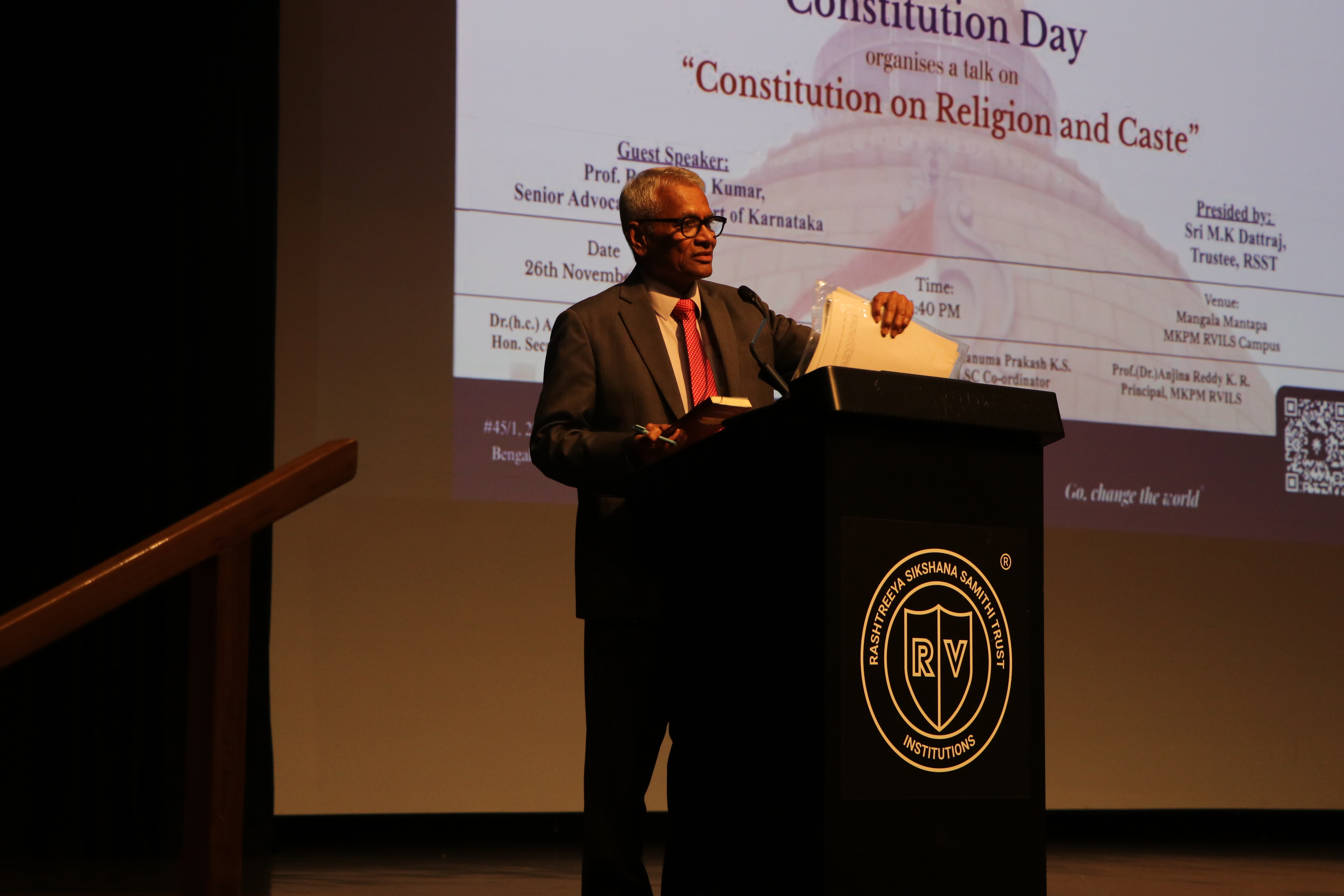 The National Service Scheme (NSS) in association with the Legal Services Clinic, MKPM RV Institute of Legal Studies, Bengaluru, organised an insightful talk titled “Constitution on Religion and Caste” on 26th November 2025 at Mangala Mantapa, MKPM RVILS. The session was graced by the distinguished presence of Prof. Ravivarma Kumar, Senior Advocate, High Court of Karnataka, Bengaluru, who served as the Chief Guest for the programme. In his elaborate address, Prof. Ravivarma Kumar discussed constitutional principles relating to equality, individual liberties, and the jurisprudence that governs caste and religious rights in India. He shed light on landmark judicial decisions and the evolving constitutional discourse on discrimination, social justice, and secularism. The event was presided over by Sri M.K. Dattraj, Trustee, Ramaiah Seva Samithi Trust (RSST), Bengaluru. The programme was held under the leadership of Prof. (Dr.) Anjina Reddy K.R., Principal, MKPM RVILS, and was coordinated by Ms Bhavana C, NSS Programme Officer, along with Dr Hanuma Prakash K.S., Legal Services Clinic Coordinator. The session witnessed enthusiastic participation from students and faculty members, encouraging dialogue on constitutional values and the role of legal institutions in strengthening social justice. The initiative reflects MKPM RVILS’s commitment to fostering socially-responsible legal education and constitutional awareness among budding legal professionals.