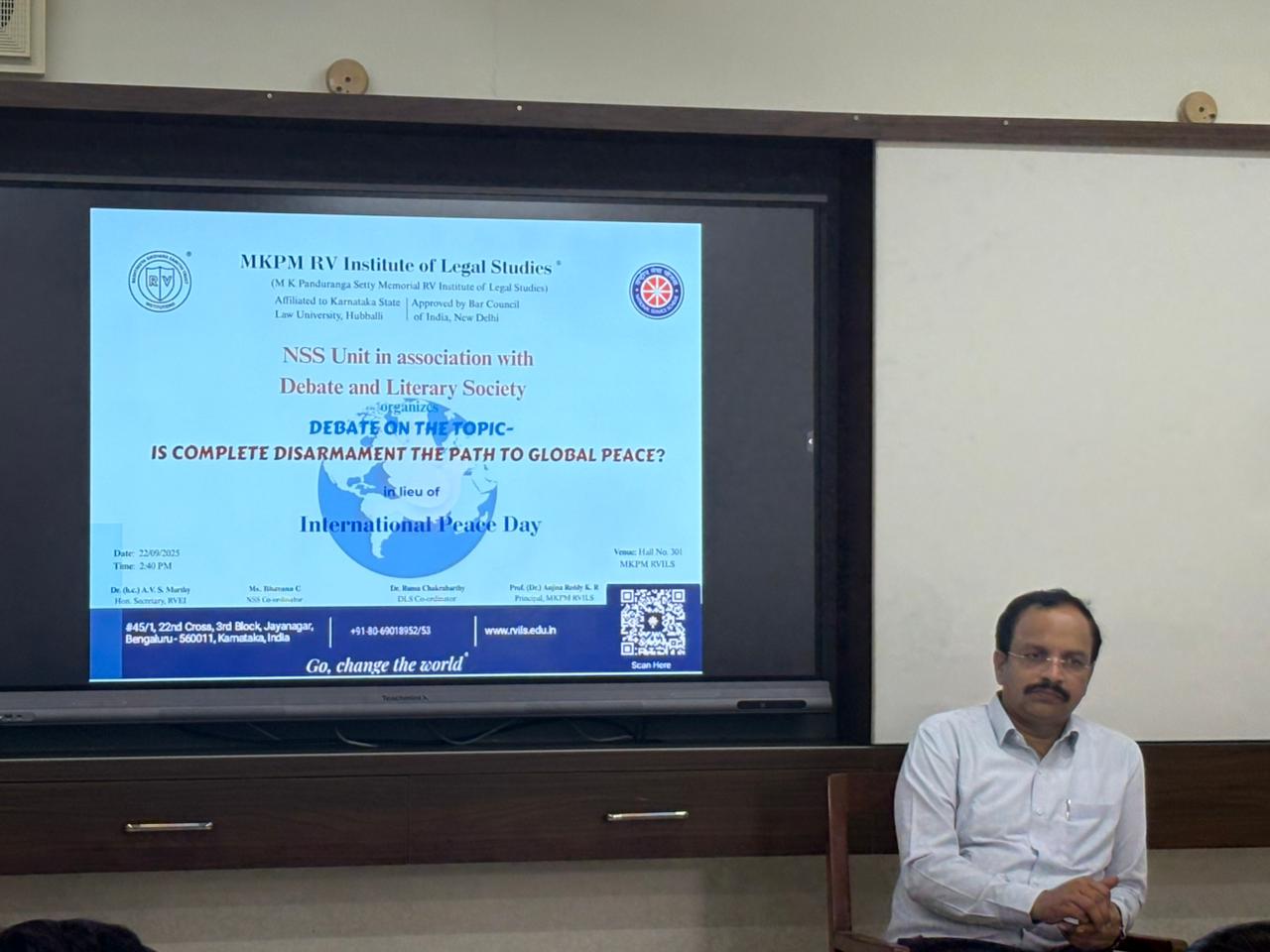 On 22nd September 2025, at 2:45 in Room numbers 301 & 302, The National Service Scheme Unit, in association with the Debate and Literary Society of MKPM RV Institute of Legal Studies, organised a Debate Competition on the topic “Is Complete Disarmament the Path to Global Peace?” in observance of International Peace Day in English and Kannada. The programme commenced with a warm welcome extended to Prof. Dr Anjina Reddy K. R., Principal, MKPM RVILS. The event was conducted under the able guidance of Ms Bhavana C., NSS Programme Officer, whose support and encouragement played a key role in the successful organisation of the debate. Students actively participated, putting forth thought-provoking arguments both in favour of and against the motion. The debate encouraged critical reflection on global security, international relations, and the role of disarmament in promoting peace. It also provided a platform for students to enhance their analytical and oratory skills while engaging with pressing global issues.