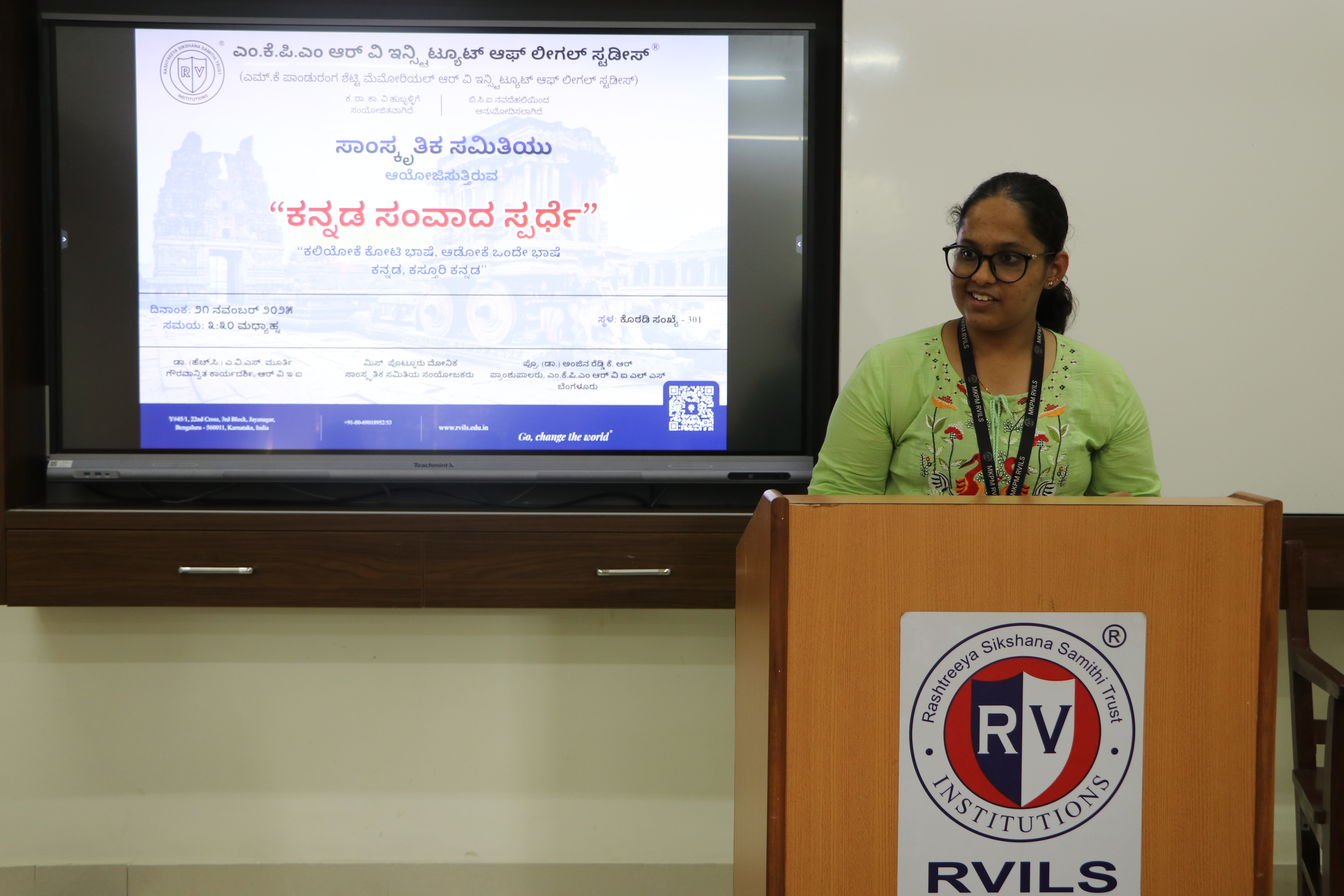 As part of the Kannada Rajyotsava celebrations, MKPM RV Institute of Legal Studies organised an engaging series of student-centred activities on the 21st and 22nd of November, 2025. The two-day event lineup featured Debate, Painting, Quiz, and Essay Writing competitions, offering students a vibrant platform to showcase their ideas, creativity, and intellectual abilities. These activities not only highlighted the diverse talents of ou r students but also helped build enthusiasm and cultural spirit ahead of the main celebration. The event was graced by Prof. (Dr.) Anjina Reddy K. R., Principal, MKPM RVILS, whose presence added great encouragement to the participants. The celebrations and competitions were efficiently coordinated by Ms Potnuru Monica, Coordinator of the Cultural Committee, ensuring smooth execution and enthusiastic participation across all events. The institution proudly marked Kannada Rajyothsava with an atmosphere of learning, creativity, and cultural pride—reflecting its commitment to fostering holistic development and honouring Karnataka’s rich heritage.