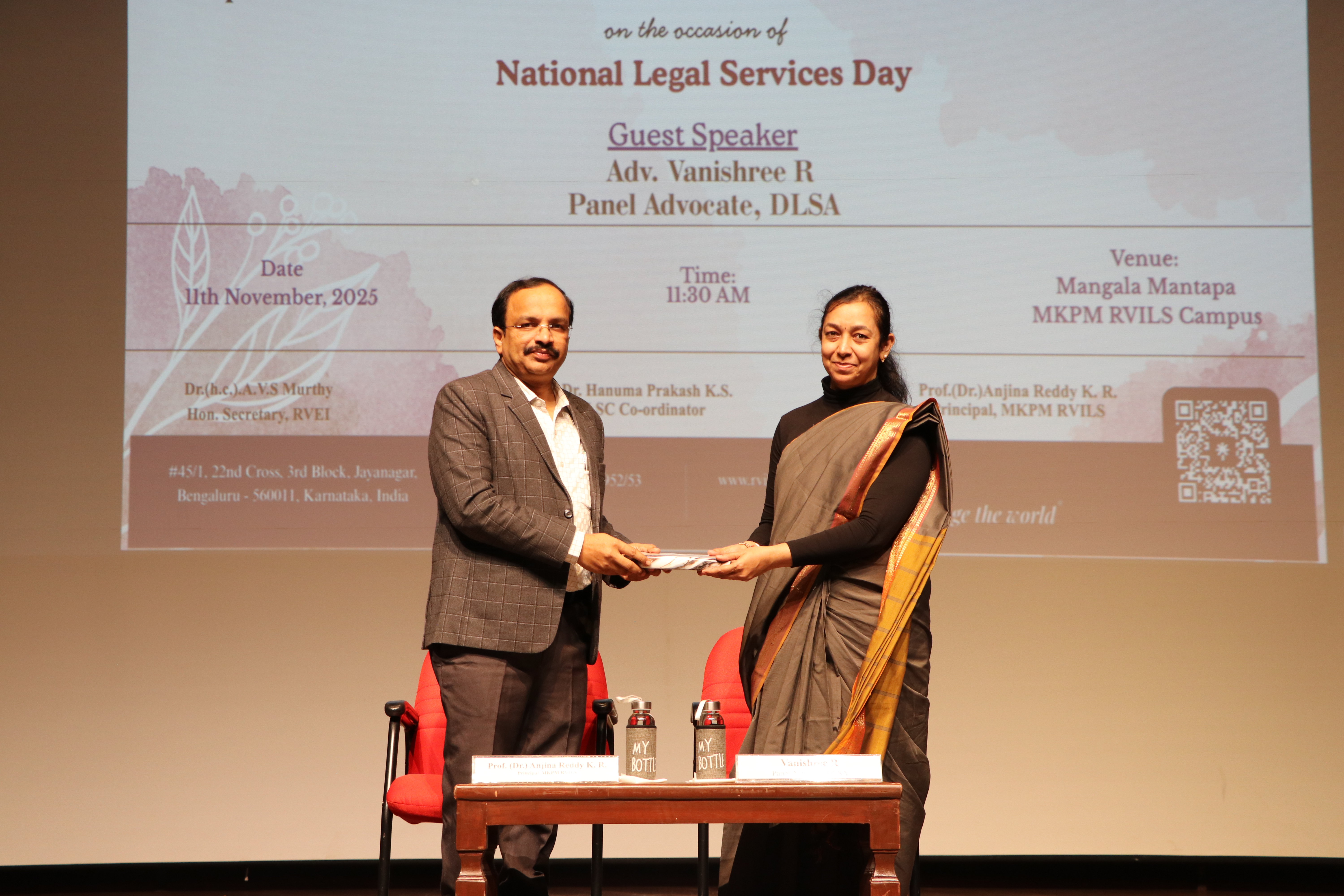 MKPM RV Institute of Legal Studies, in association with the District Legal Services Authority, Bengaluru Urban, successfully organised a special talk on“Compensation Scheme for Women Victims/Survivors of Sexual Assault/Other Crimes” on the occasion of National Legal Services Day. The session, titled “Compensation Scheme for Women Victims/Survivors of Sexual Assault/Other Crimes,” was held on 11th November 2025 at Mangala Mantapa, MKPM RVILS Campus. We were honoured to host Adv. Vanishree R, Panel Advocate, DLSA, as the Guest Speaker. Her insightful address shed light on the legal remedies, support mechanisms, and compensation frameworks available to women who are victims or survivors of sexual assault and other offences. The session aimed to spread awareness, empower students, and strengthen their understanding of victim-centric legal provisions. The event was graced by Prof. (Dr.) Anjina Reddy K.R., Principal, MKPM RVILS. The programme was coordinated by Prof. (Dr.) Hanuma Prakash K.S., Legal Services Clinic Coordinator. Through this initiative, MKPM RVILS continues its commitment to nurturing legally informed and socially responsible citizens.