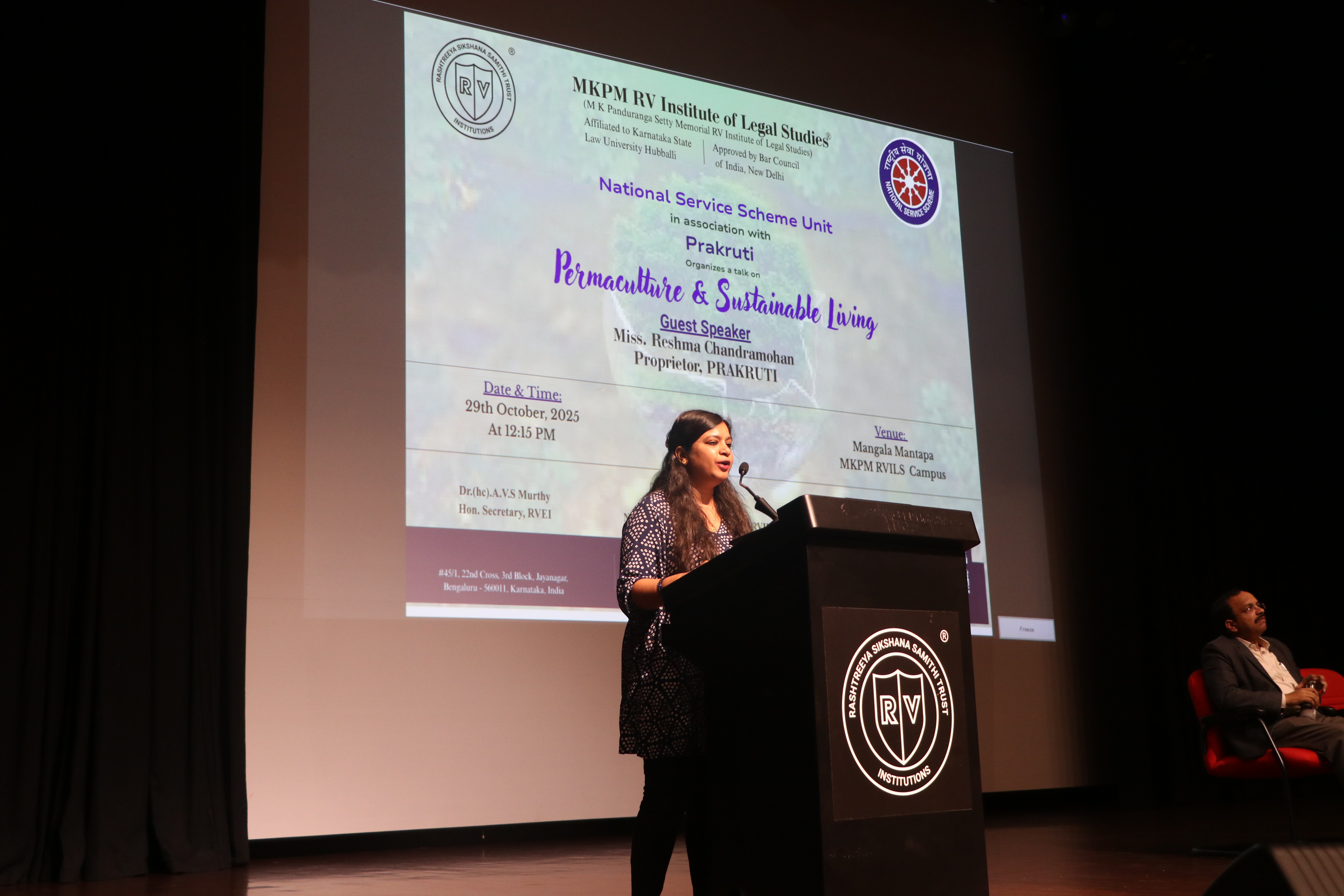 The National Service Scheme (NSS) Unit of MKPM RV Institute of Legal Studies, in association with Prakruti, organized an enlightening talk on “Permaculture & Sustainable Living” on 29th October 2025 at 12:15 PM in Mangala Mantapa, MKPM RVILS Campus, Jayanagar, Bengaluru. The guest speaker for the session was Ms Reshma Chandramohan, Proprietor of Prakruti, who shared valuable insights into the philosophy and practice of permaculture—a sustainable way of living that harmonises human activity with nature. She explained how simple lifestyle choices and ecological awareness can contribute to long-term environmental balance and social well-being. The event was presided over by Prof. (Dr) Anjina Reddy K.R., Principal, MKPM RVILS, and guided under the leadership of the programme coordinator, Ms Bhavana C, NSS Programme Officer, MKPM RVILS. Students actively participated in the session, discussing innovative approaches to sustainability and the legal dimensions of environmental protection. The talk encouraged young legal minds to reflect on their responsibility towards nature and the role of law in fostering ecological justice. Through such initiatives, MKPM RV Institute of Legal Studies continues to promote holistic education that blends environmental consciousness with social responsibility, aligning with the institution’s vision of nurturing responsible citizens and ethical professionals.