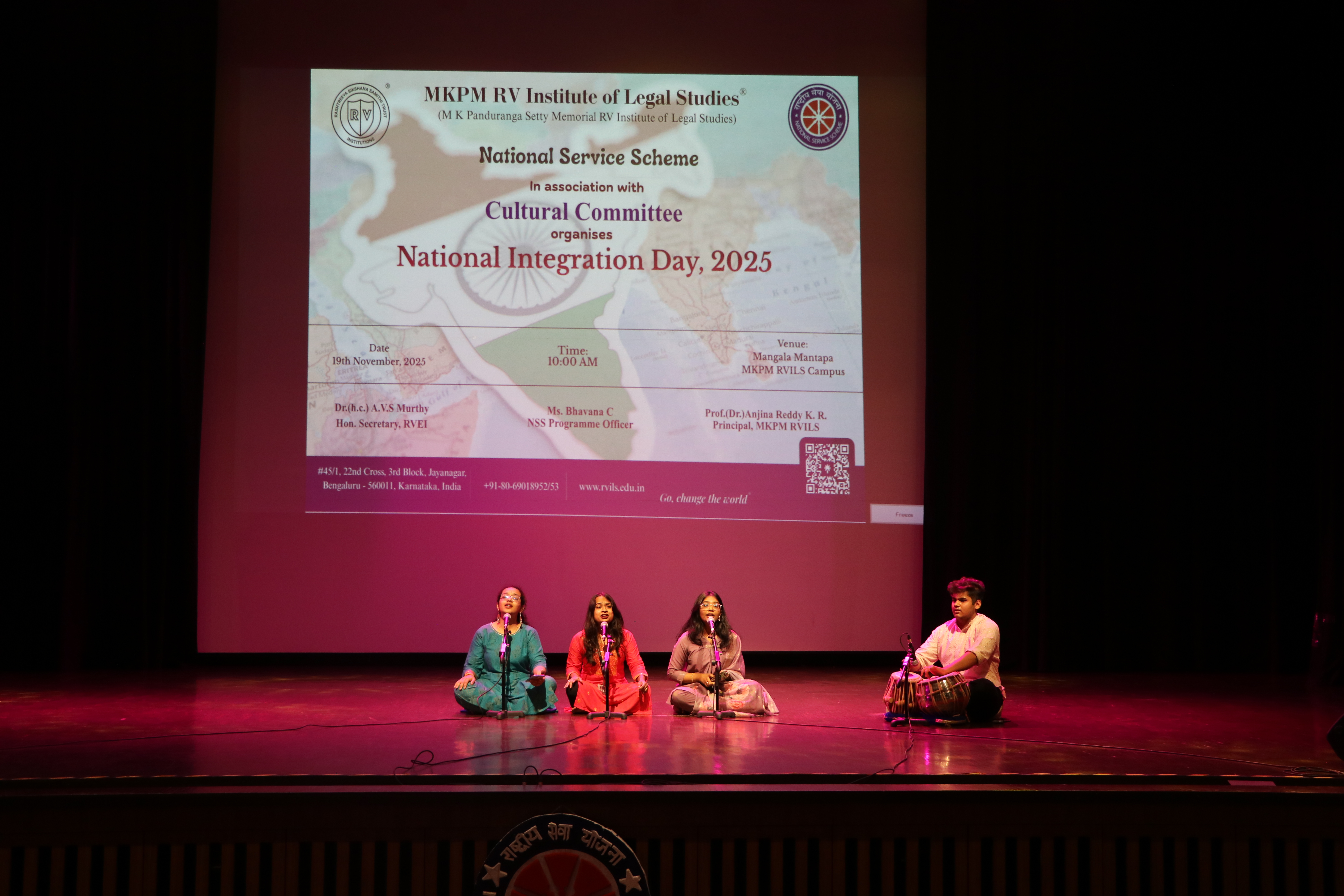 The M.K. Panduranga Setty Memorial RV Institute of Legal Studies (MKPM RVILS), through its National Service Scheme (NSS) Unit in association with the Cultural Committee, organised National Integration Day 2025 on 19th November 2025 at 10:00 am, Mangala Mantapa, MKPM RVILS Campus. The programme aimed to promote unity, cultural harmony, and a sense of shared national identity among students. The event highlighted the importance of integration as a foundational strength of India’s democratic fabric, encouraging students to uphold constitutional values and foster inclusivity. The event was graced by Prof. (Dr.) Anjina Reddy K. R., Principal, MKPM RVILS, coordinated by Ms Bhavana C, NSS Programme Officer. The celebration brought together students and faculty in a collective reflection on the significance of national unity and responsible citizenship. The programme featured activities that reinforced the spirit of togetherness and communal harmony, marking the occasion with enthusiasm and active student participation.