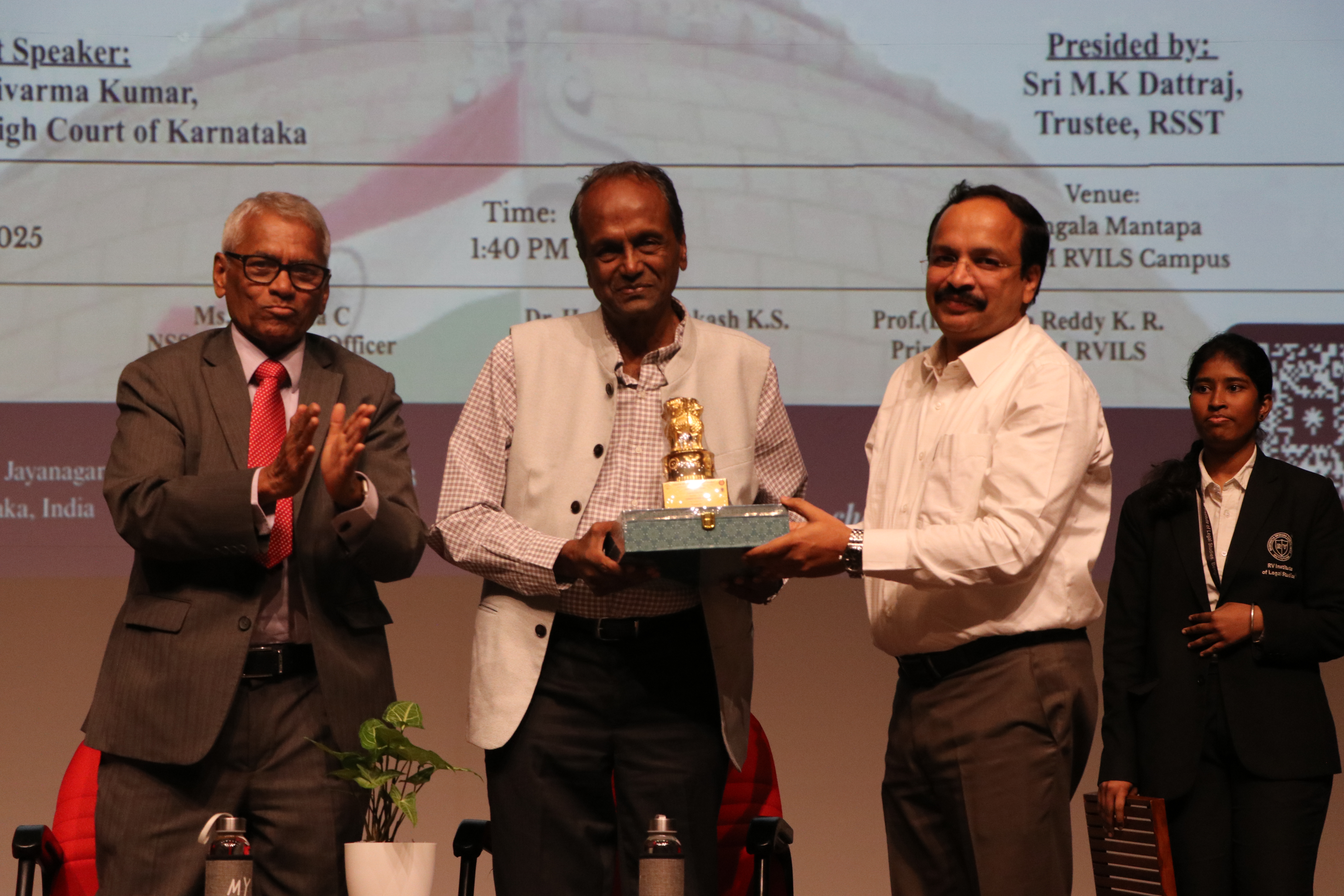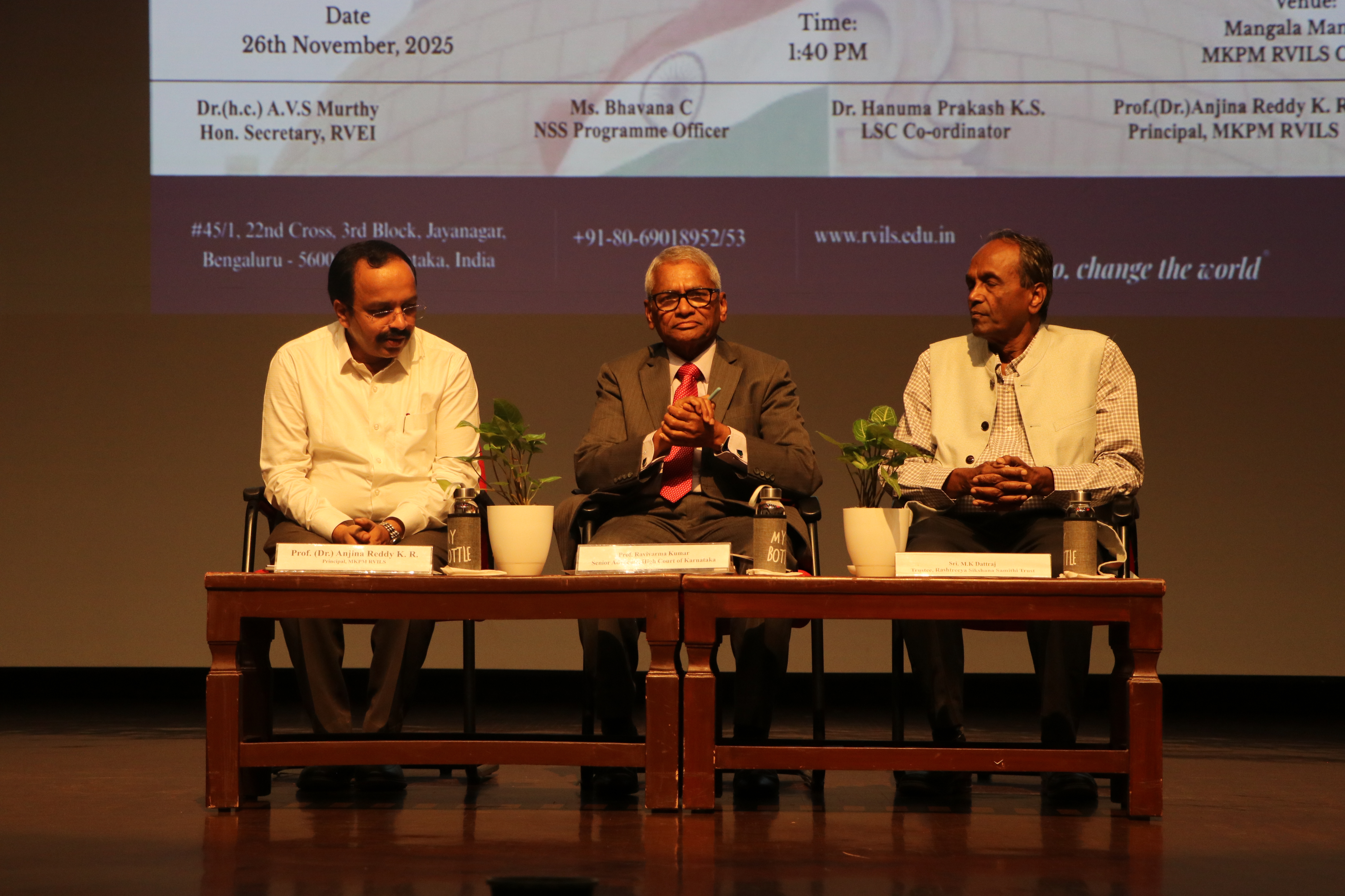 The National Service Scheme (NSS) in association with the Legal Services Clinic, MKPM RV Institute of Legal Studies, Bengaluru, organised an insightful talk titled “Constitution on Religion and Caste” on 26th November 2025 at Mangala Mantapa, MKPM RVILS. The session was graced by the distinguished presence of Prof. Ravivarma Kumar, Senior Advocate, High Court of Karnataka, Bengaluru, who served as the Chief Guest for the programme. In his elaborate address, Prof. Ravivarma Kumar discussed constitutional principles relating to equality, individual liberties, and the jurisprudence that governs caste and religious rights in India. He shed light on landmark judicial decisions and the evolving constitutional discourse on discrimination, social justice, and secularism. The event was presided over by Sri M.K. Dattraj, Trustee, Ramaiah Seva Samithi Trust (RSST), Bengaluru. The programme was held under the leadership of Prof. (Dr.) Anjina Reddy K.R., Principal, MKPM RVILS, and was coordinated by Ms Bhavana C, NSS Programme Officer, along with Dr Hanuma Prakash K.S., Legal Services Clinic Coordinator. The session witnessed enthusiastic participation from students and faculty members, encouraging dialogue on constitutional values and the role of legal institutions in strengthening social justice. The initiative reflects MKPM RVILS’s commitment to fostering socially-responsible legal education and constitutional awareness among budding legal professionals.
