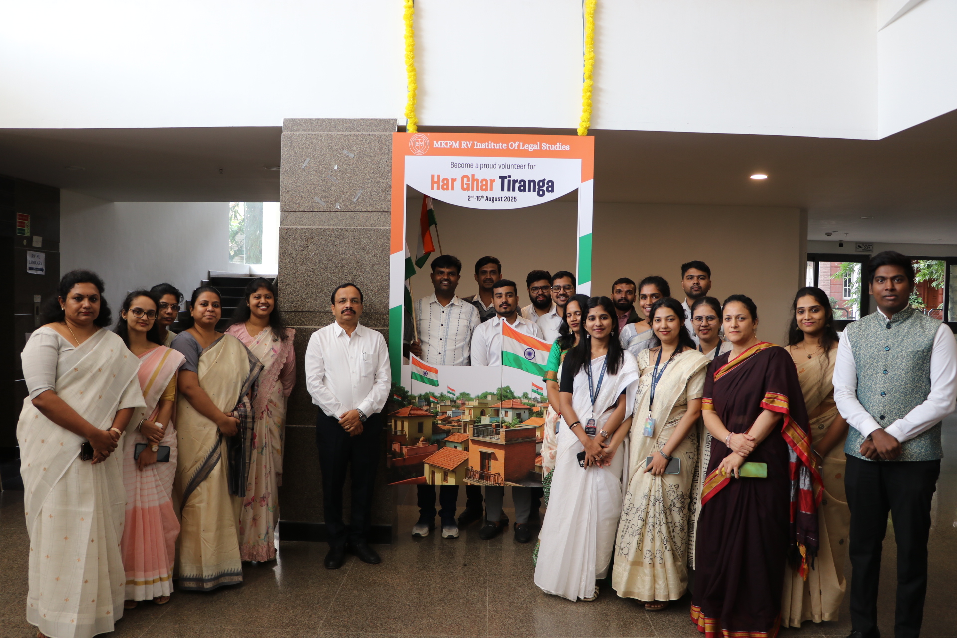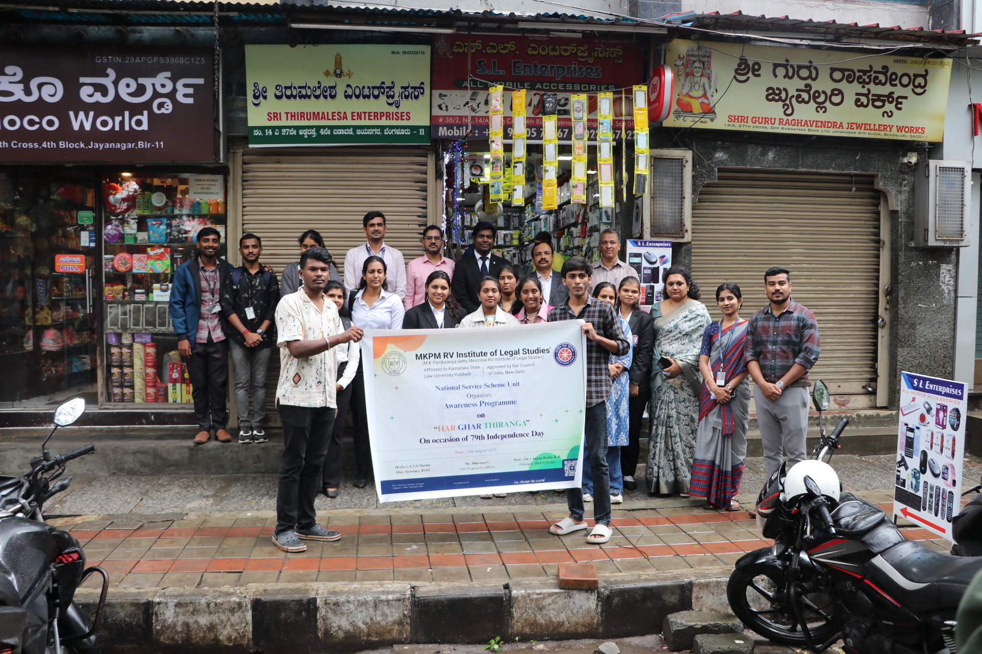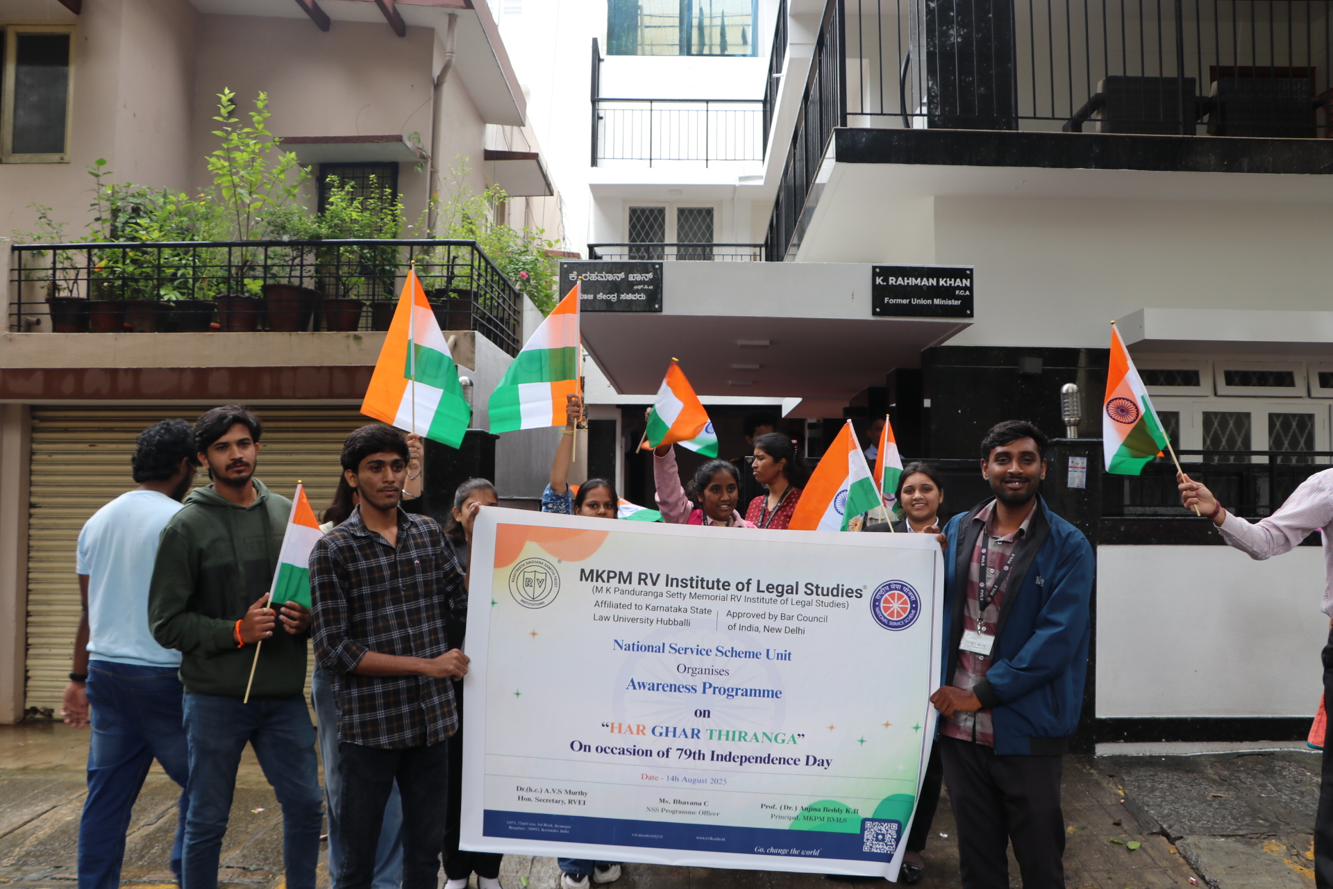 In Observance of the 79th Independence Day, the National Service Scheme of MKPM RV Institute of Legal Studies organised a jatha ( awareness rally) on 14th August, 2025. The event was led by the chairman and Principal, Prof.(Dr.) Anjina Reddy K R, Ms. Bhavana C, Academic Coordinator and NSS Co-Ordinator, NSS members, along with NSS volunteers. As part of the rally, students enthusiastically distributed national flags to people at their homes, shops, and in the neighbourhood, spreading the spirit of patriotism and encouraging citizens to proudly display the Tiranga. The event not only celebrated freedom but also fostered unity, responsibility, and national pride among the community.