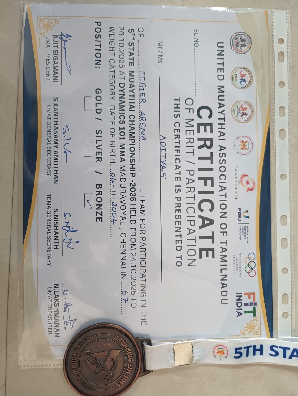 We are delighted to share that the students of MKPM RV Institute of Legal Studies, Aditya S., representing Tiger Arena, have brought pride to the institution by winning the Bronze Medal at the 5th State Muaythai Championship 2025. The championship was organised by the United Muaythai Association of Tamil Nadu and held at Dynamics 101 MMA, Madurai, from 24th to 26th October 2025. Competing against skilled participants from across the state, Aditya demonstrated remarkable discipline, strength, and sportsmanship throughout the event. His achievement stands as a testament to his dedication to the sport and the rigorous training undertaken in preparation for the championship. We extend our heartfelt congratulations to Aditya for securing this commendable victory and for representing our institution with excellence. His success continues to inspire our student community to pursue both academic and extracurricular excellence with passion and determination.