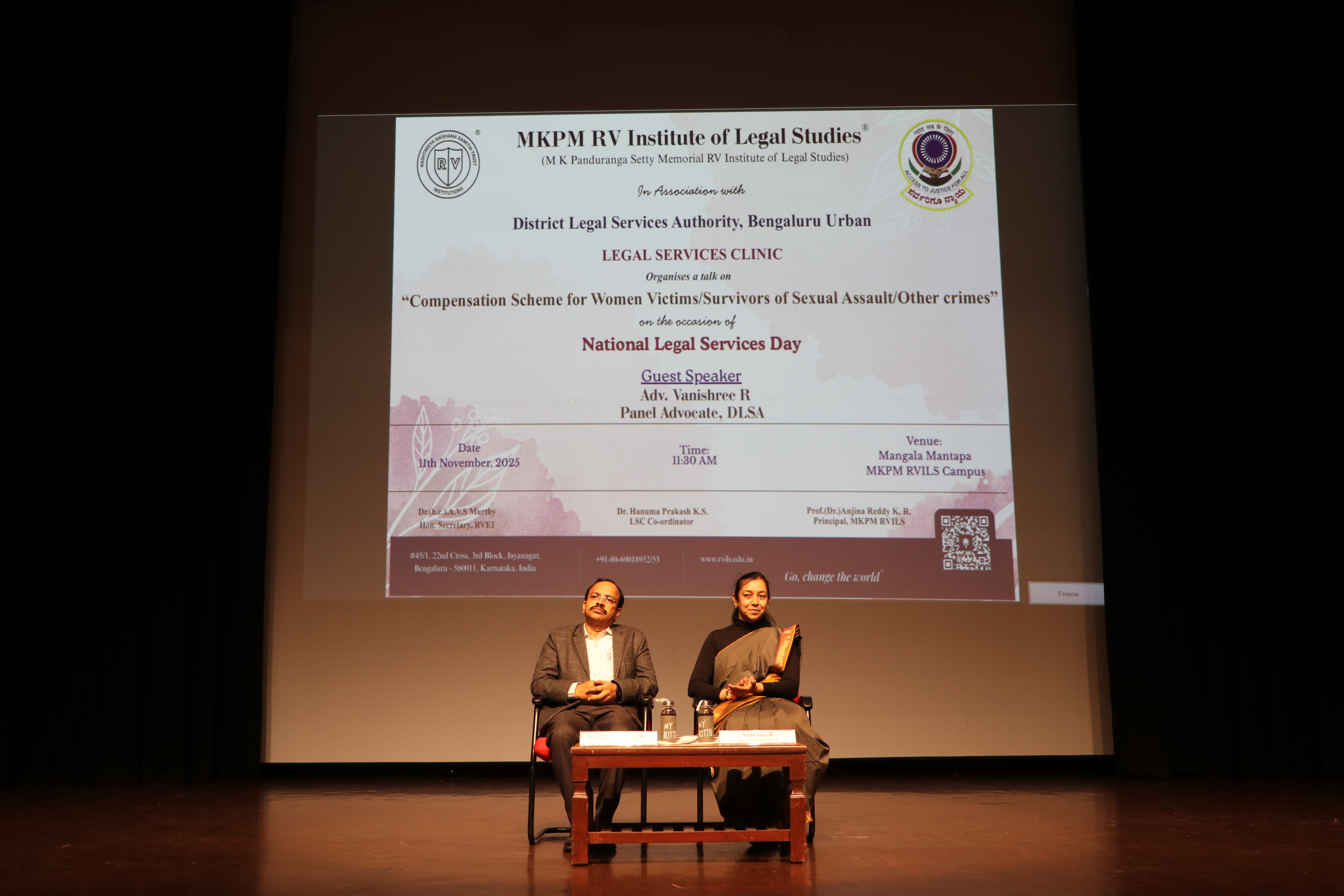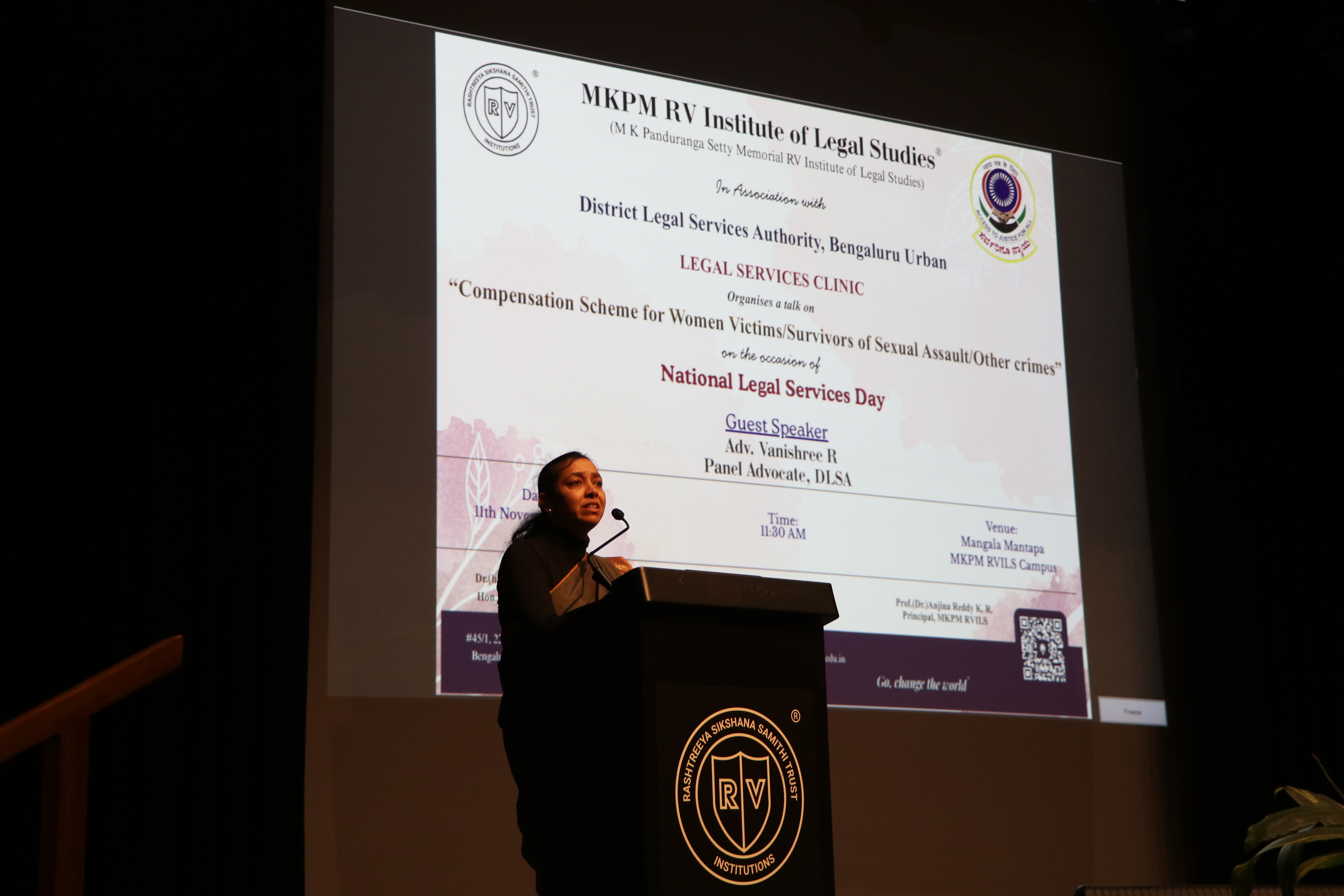 MKPM RV Institute of Legal Studies, in association with the District Legal Services Authority, Bengaluru Urban, successfully organised a special talk on“Compensation Scheme for Women Victims/Survivors of Sexual Assault/Other Crimes” on the occasion of National Legal Services Day. The session, titled “Compensation Scheme for Women Victims/Survivors of Sexual Assault/Other Crimes,” was held on 11th November 2025 at Mangala Mantapa, MKPM RVILS Campus. We were honoured to host Adv. Vanishree R, Panel Advocate, DLSA, as the Guest Speaker. Her insightful address shed light on the legal remedies, support mechanisms, and compensation frameworks available to women who are victims or survivors of sexual assault and other offences. The session aimed to spread awareness, empower students, and strengthen their understanding of victim-centric legal provisions. The event was graced by Prof. (Dr.) Anjina Reddy K.R., Principal, MKPM RVILS. The programme was coordinated by Prof. (Dr.) Hanuma Prakash K.S., Legal Services Clinic Coordinator. Through this initiative, MKPM RVILS continues its commitment to nurturing legally informed and socially responsible citizens.