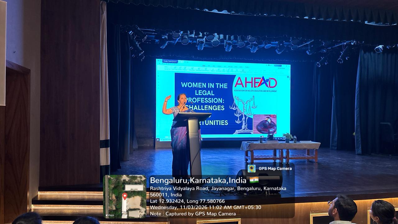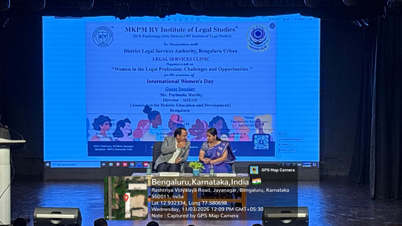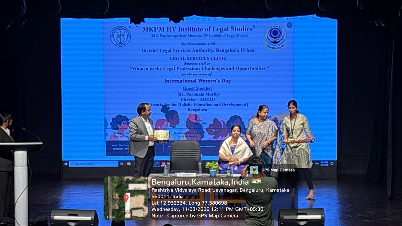 The Legal Services Committee (LSC) of MKPM RV Institute of Legal Studies organised a special programme on International Women’s Day on 11th March 2026, focusing on women’s empowerment in the legal field. The session was delivered by Parimala Murthy, Director of the Association for Holistic Education & Development(AHEAD). She spoke on the topic “Women in the Legal Profession: Challenges & Opportunities”, offering valuable insights into the evolving role of women in law. The session highlighted key challenges such as gender bias, work-life balance, and representation in leadership roles, while also exploring the growing opportunities for women to excel and lead in the legal profession. The programme inspired students to reflect on the importance of equality, perseverance, and professional growth, while encouraging them to contribute towards a more inclusive and equitable legal system.